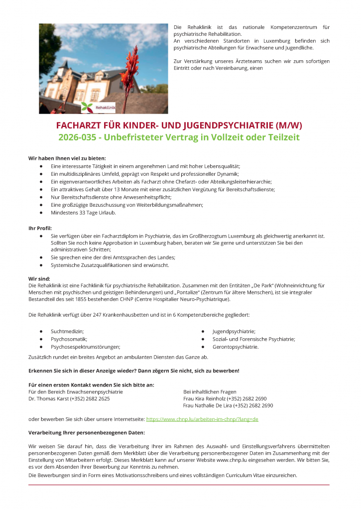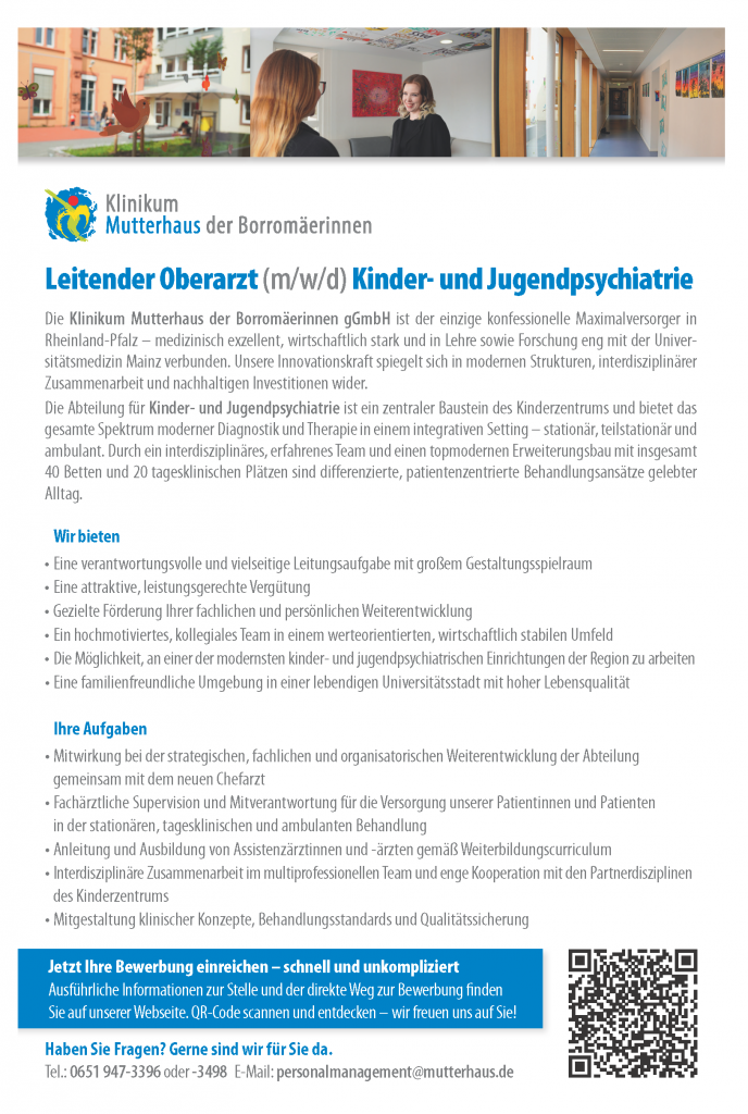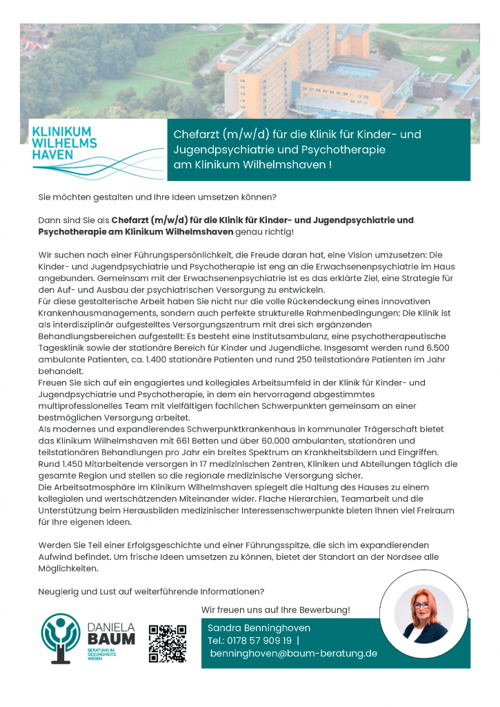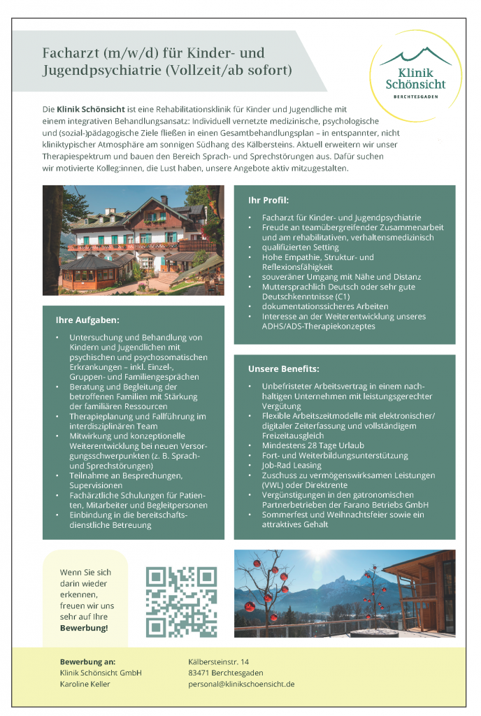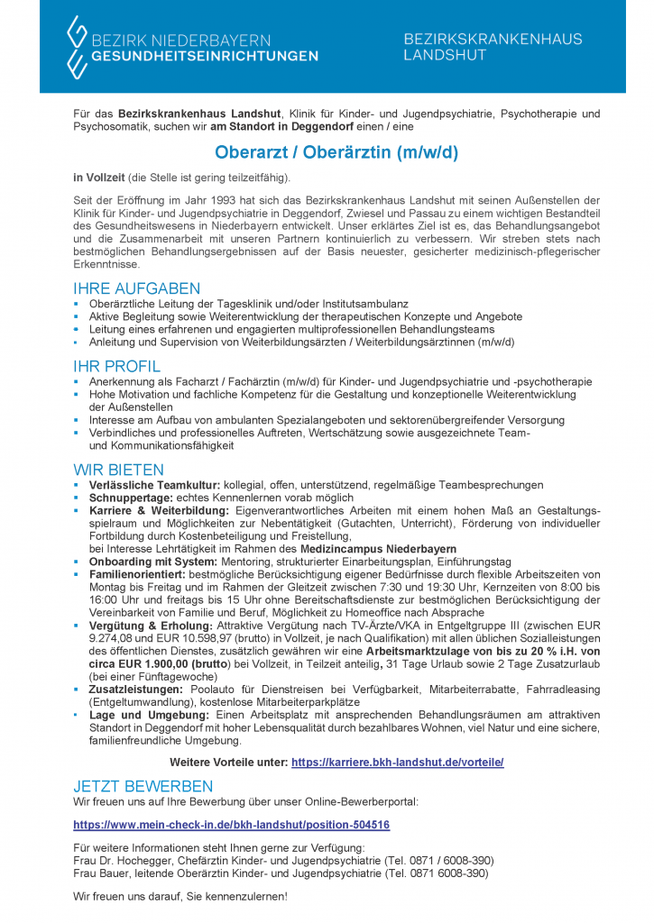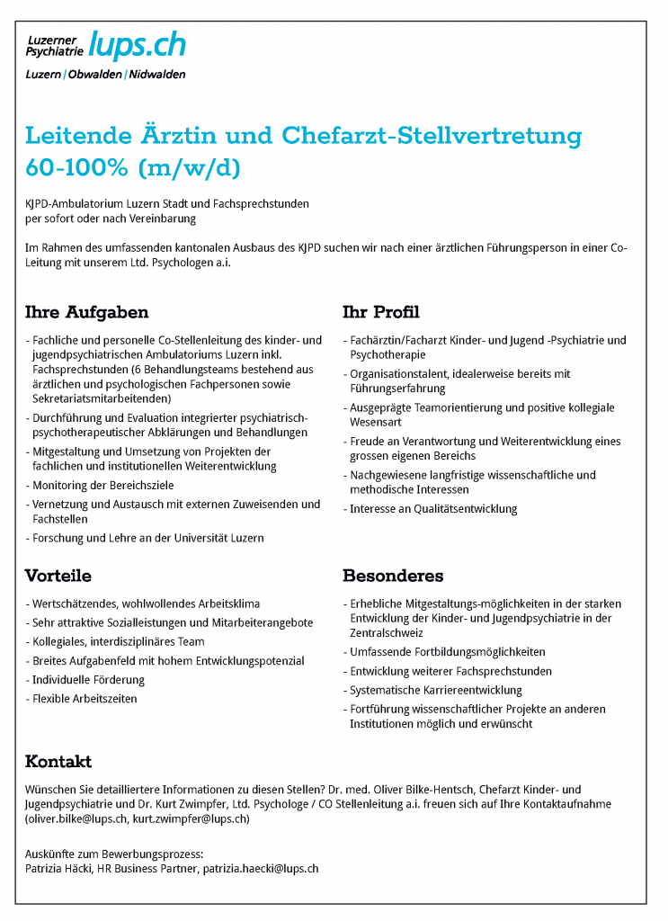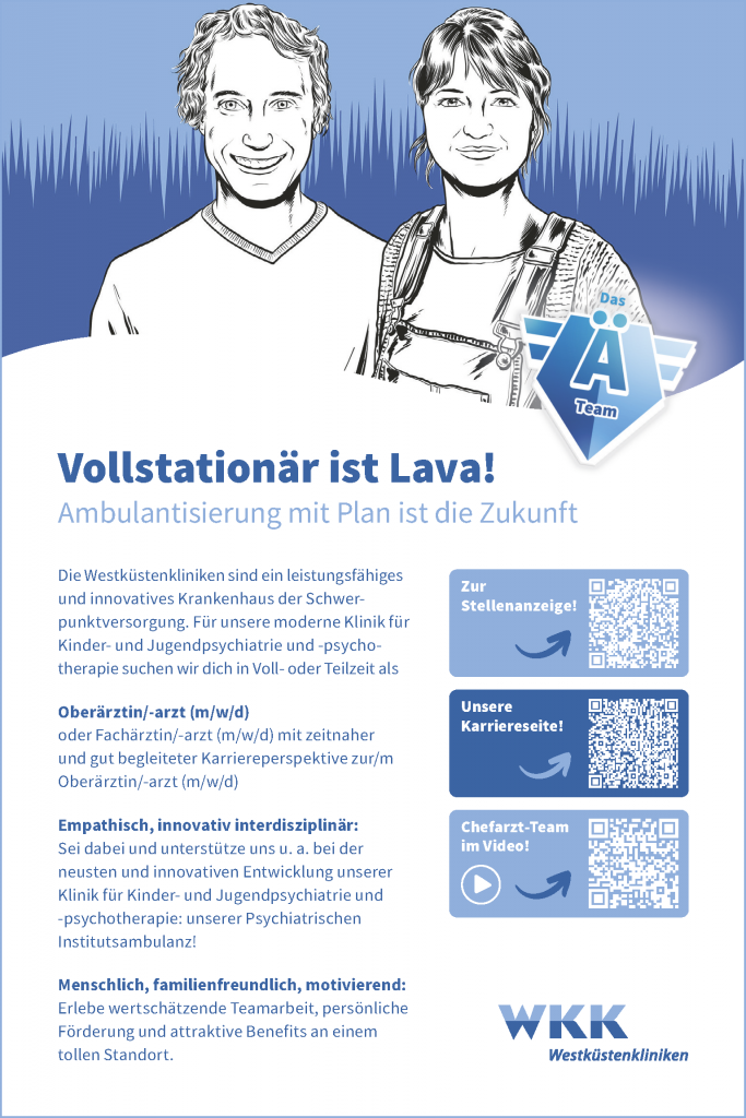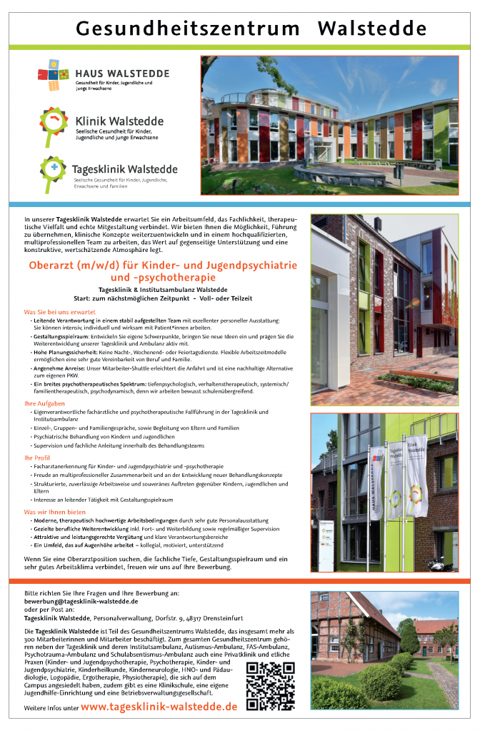 Die Veröffentlichung einer Stellenanzeige oder eines Stellengesuchs auf dieser Website ist mit der Veröffentlichung einer Stellenanzeige oder eines Stellengesuchs in der Papierform der Fachzeitschrift „Forum der Kinder- und Jugendpsychiatrie und Psychotherapie“ verbunden und daher kostenpflichtig. Bitte wenden Sie sich an die BKJPP-Geschäftsstelle: