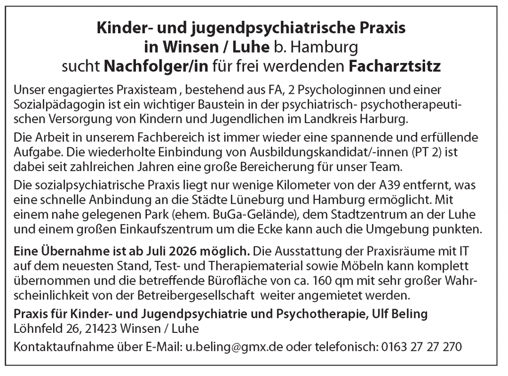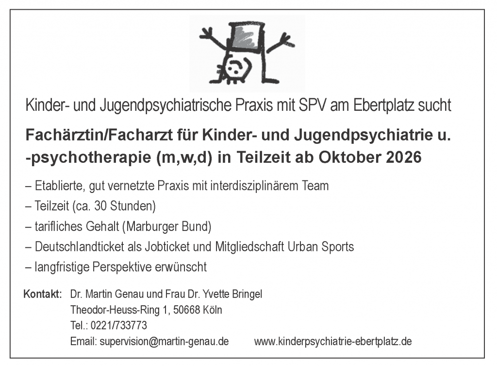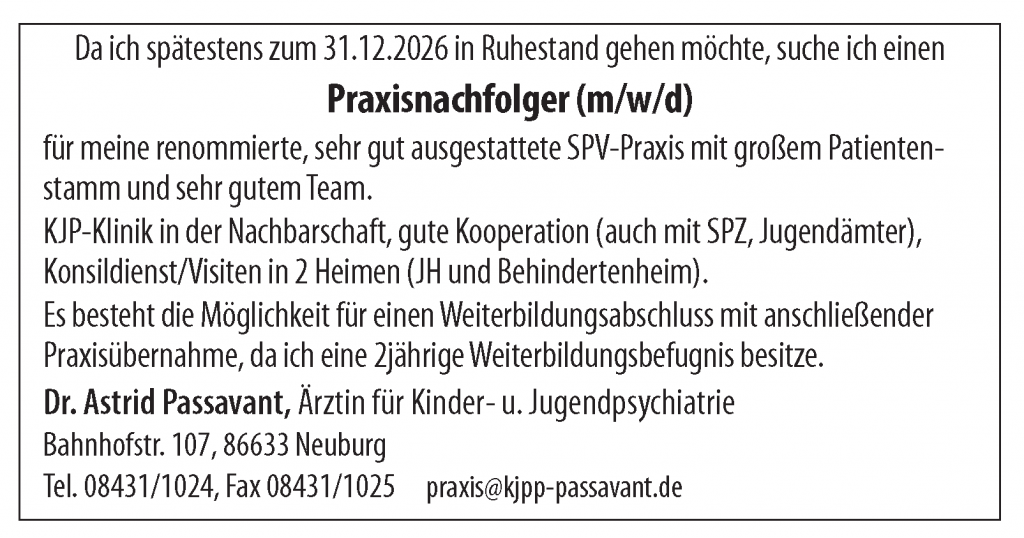 Die Veröffentlichung einer Stellenanzeige oder eines Stellengesuchs auf dieser Website ist mit der Veröffentlichung einer Stellenanzeige oder eines Stellengesuchs in der Papierform der Fachzeitschrift „Forum der Kinder- und Jugendpsychiatrie und Psychotherapie“ verbunden und daher kostenpflichtig. Bitte wenden Sie sich an die BKJPP-Geschäftsstelle: